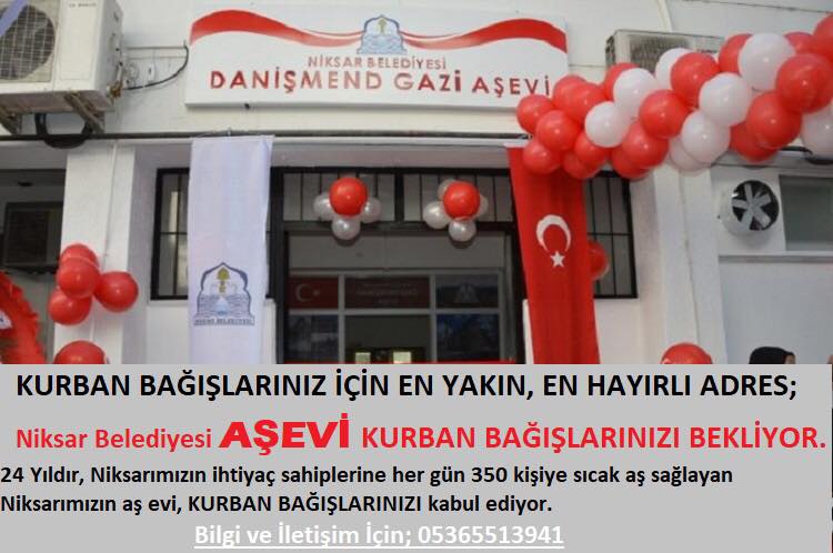KURBAN BAYRAMI YAKLAŞIRKEN VEKALETEN KURBAN KESİMİ BAĞIŞLARINIZ İÇİN EN YAKIN EN HAYIRLI ADRES NİKSARLI İHTİYAÇ SAHİPLERİN 24 YILDIR HİZMETİNDE OLAN NİKSAR BELEDİYESİ AŞ EVİNİ UNUTMAYIN.