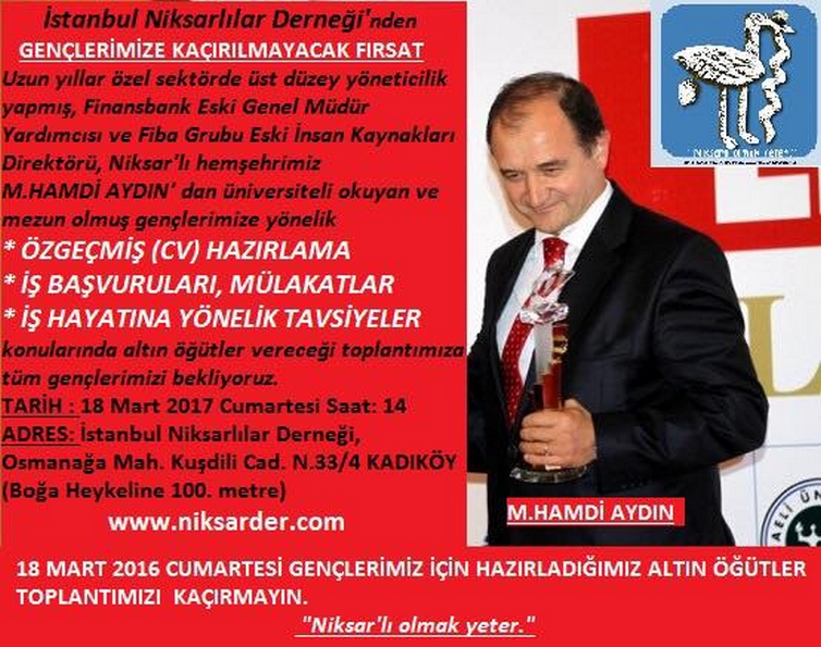 FİNANSBANK Eski Genel Müdür Yardımcısı, FİBA Grubu İnsan Kaynakları Direktörü M. HAMDİ AYDIN, 18 Mart 2016 Cumartesi günü Saat 14; de DERNEĞİMİZDE NİKSARLI GENÇLERİMİZE,