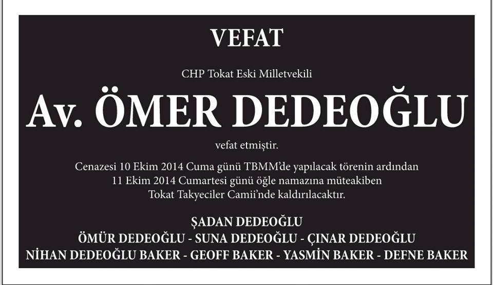Eski Tokat Milletvekili, Tokatlılar Derneği Başkanı, Ömür Dedeoğlu’ nun babası, AV. ÖMER DEDEOĞLU vefat etmiştir.